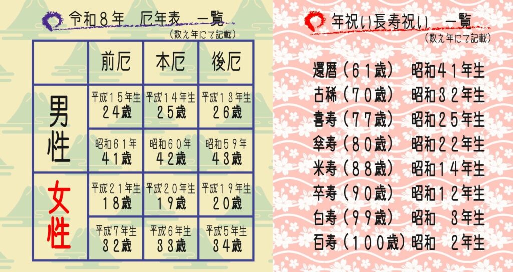 令和8年の厄年表(数え年)、安産祈願 戌の日一覧表を記載しております。ご参照下さい。ご祈祷をご希望の方はこちらのページもご参照下さい。※正月1月1日~3日までは常時受付で予めのご連絡は不要です。4日以降は準備の都合上事前にご連絡をお願い致します。